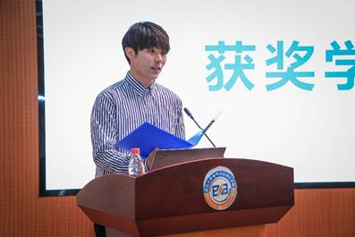 2019级逄帅同学代表全体获奖同学发表感言,他对长期关心学生成长的学院、企业、老师和同学表示诚挚的感谢,从“珞珈探索”、“电气学习”、“服务奉献”三个方面分享了自己的成长和感悟,勉励当代电气青年要勇担时代重任、服务国家建设、奉献社会发展。
